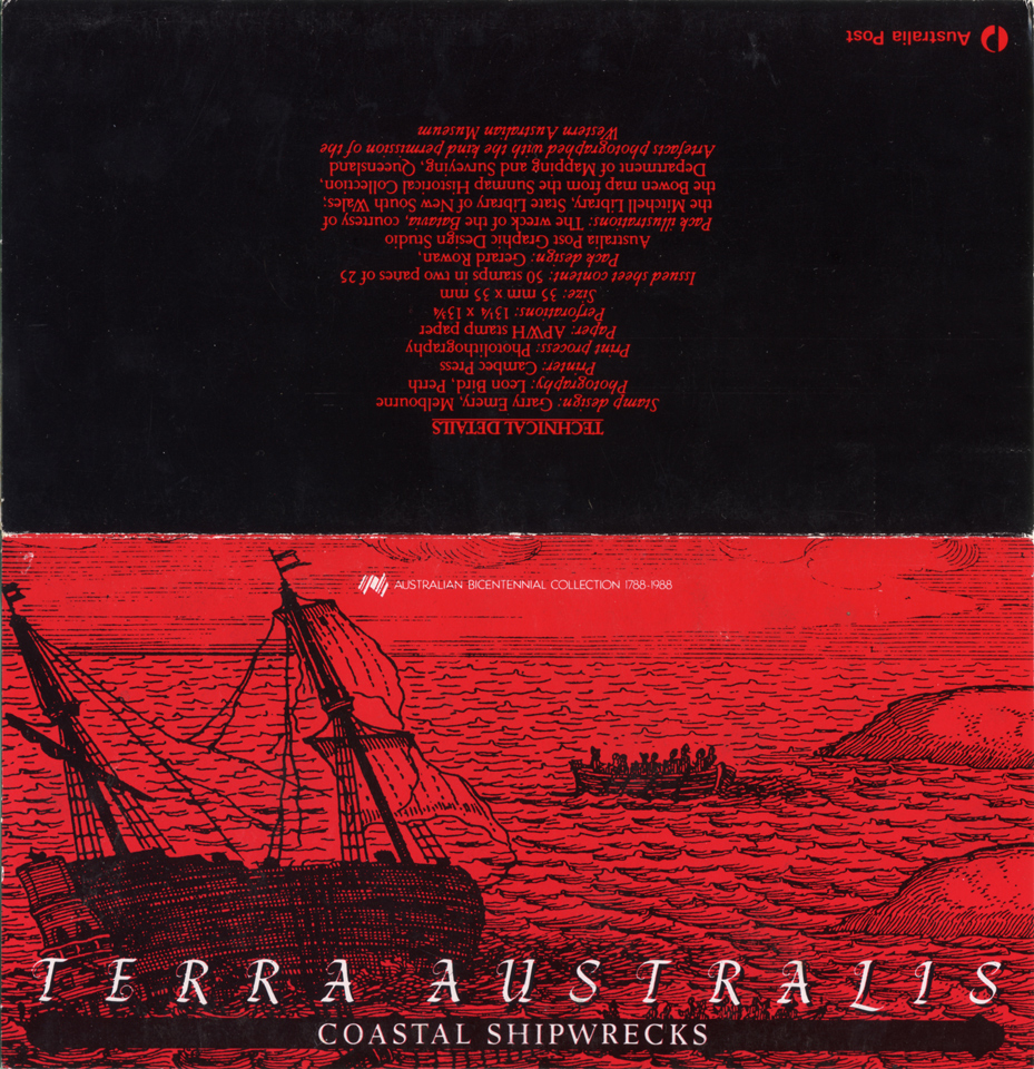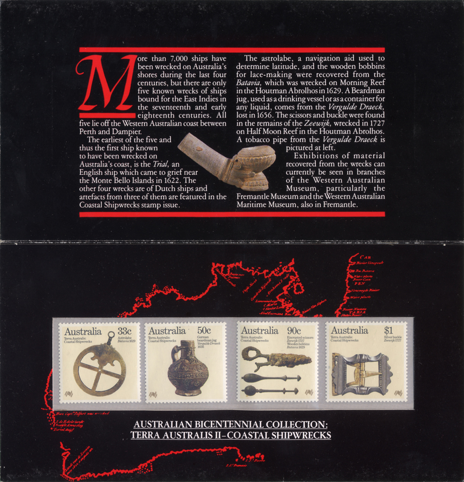 Shipwreck Stamp Folder Descriptive folder pack produced by the Australian Post for the four "Shipwreck" stamps issued in honor of the Australian Bicentennial in 1988. The stamps were actually released on October 2, 1985.