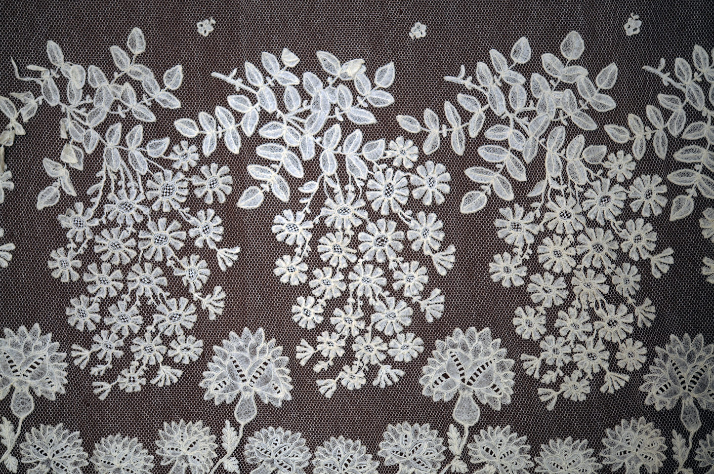 53" x 40.5" (not perfectly rectangular) Many motifs coming loose, some repair to ground. Several small hols in the mesh.