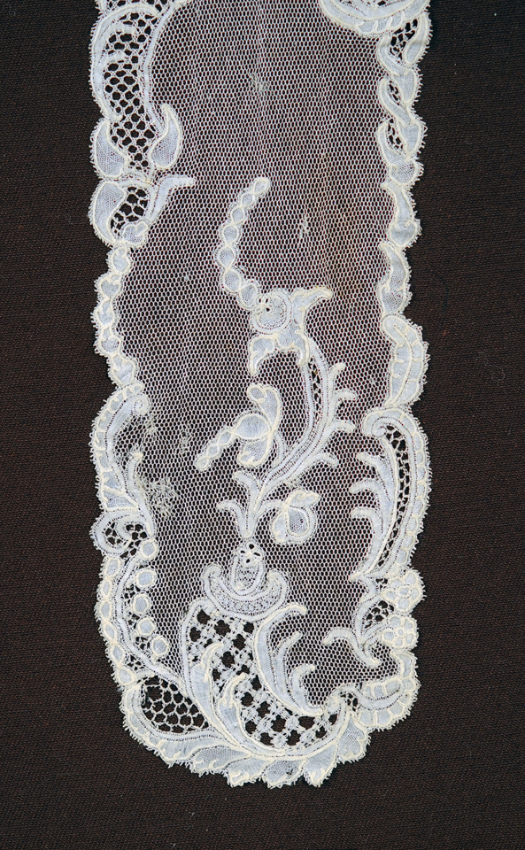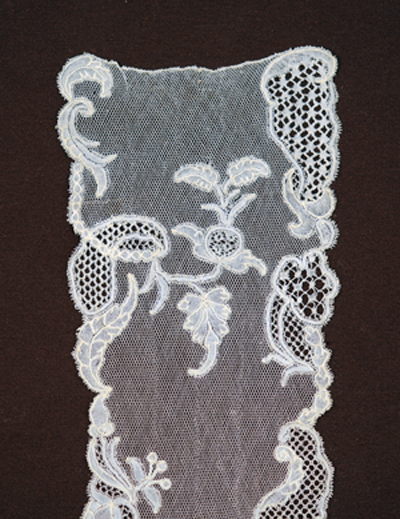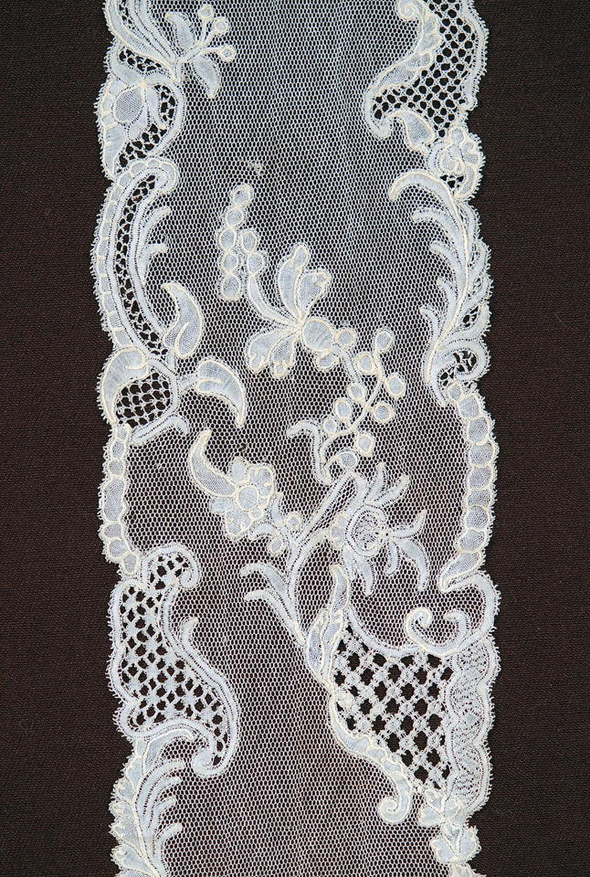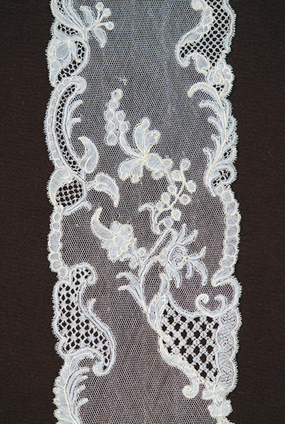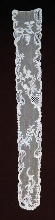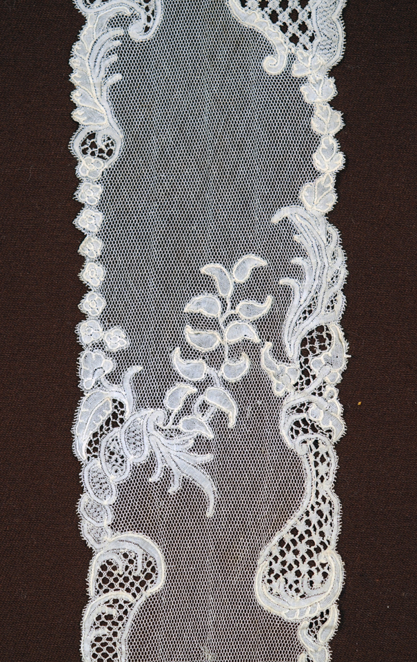 Single Brussels lappet with vrai droschel 22" x 3-1/4" Borders filled with decorative fillings, sprigs spring off alternate sides into ground. Very delicate. Droschel ground attached to motifs. purchased 12/10/1976 |