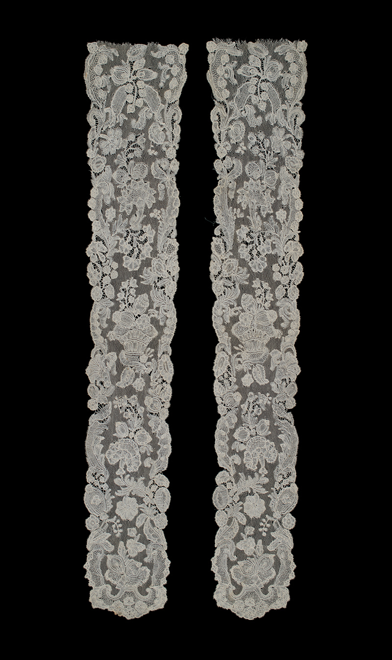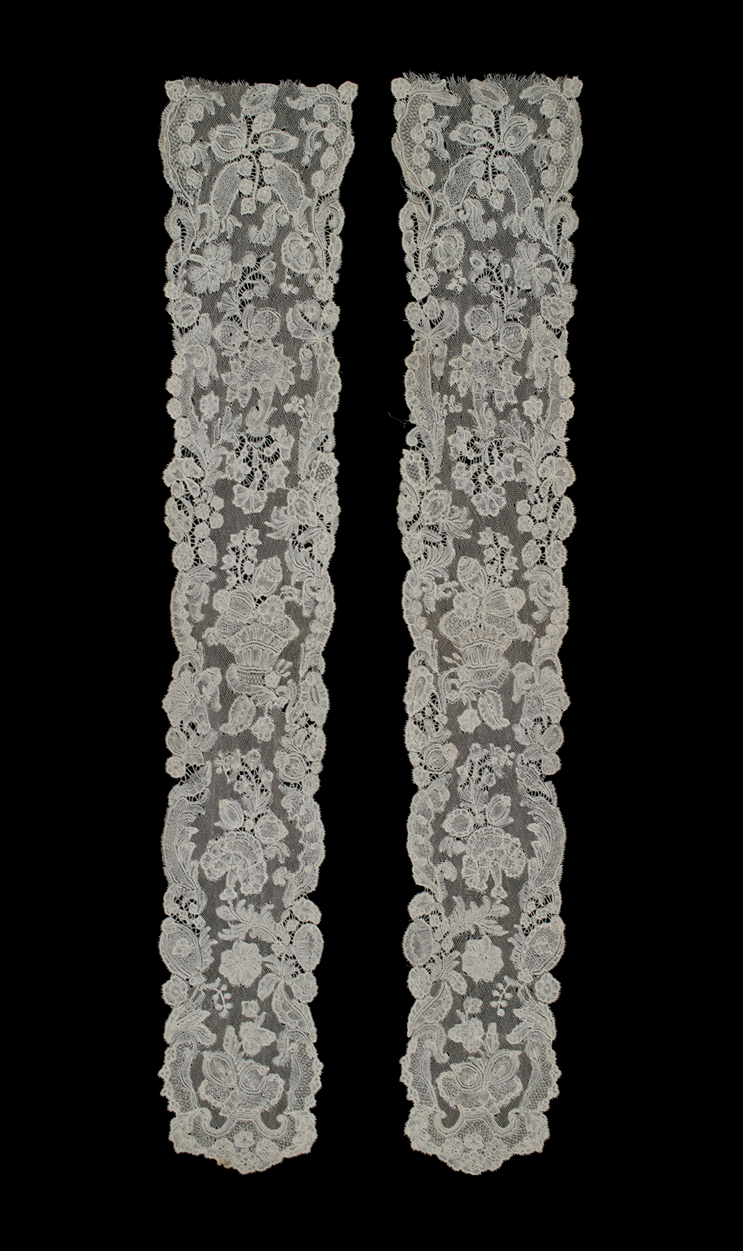 Brussels lappets with vrai droschel ~4" x 25" each A little messy crowded design. Droschel ground attached to motifs. Ex. coll. Pat Earnshaw purchased 11/21/2014 |