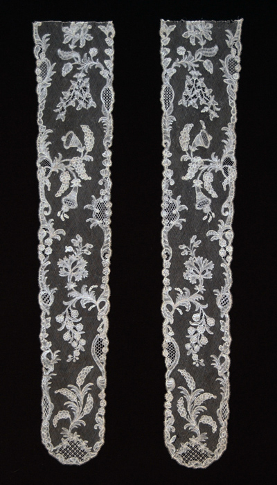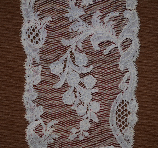 Brussels lappets with vrai droschel 3-7/8" x 43" ntinuous border with varied fillings, very slightly scalloped. Flower sprigs spring from lower end and alternate off sides into ground. Small cornucopia. Mirror images. Droschel ground attached to motifs. purchased 10/02/1978 |