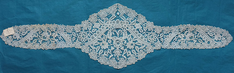 Seems similar to Belgian_pieced_bertha_1 - note half stitch motifs and similar curling tendrils. Tag pinned to one end reads: de Cousin Jean Bruges