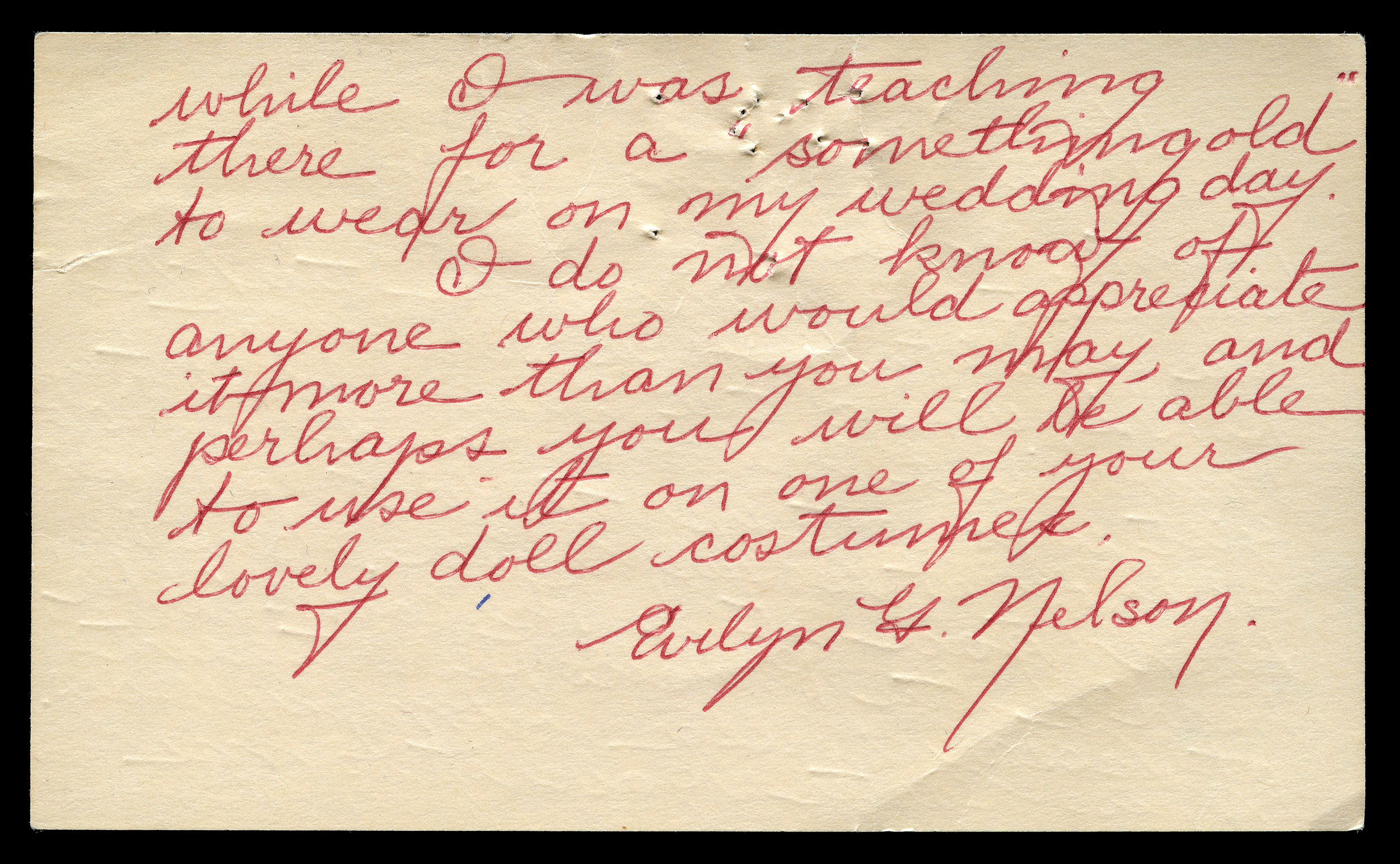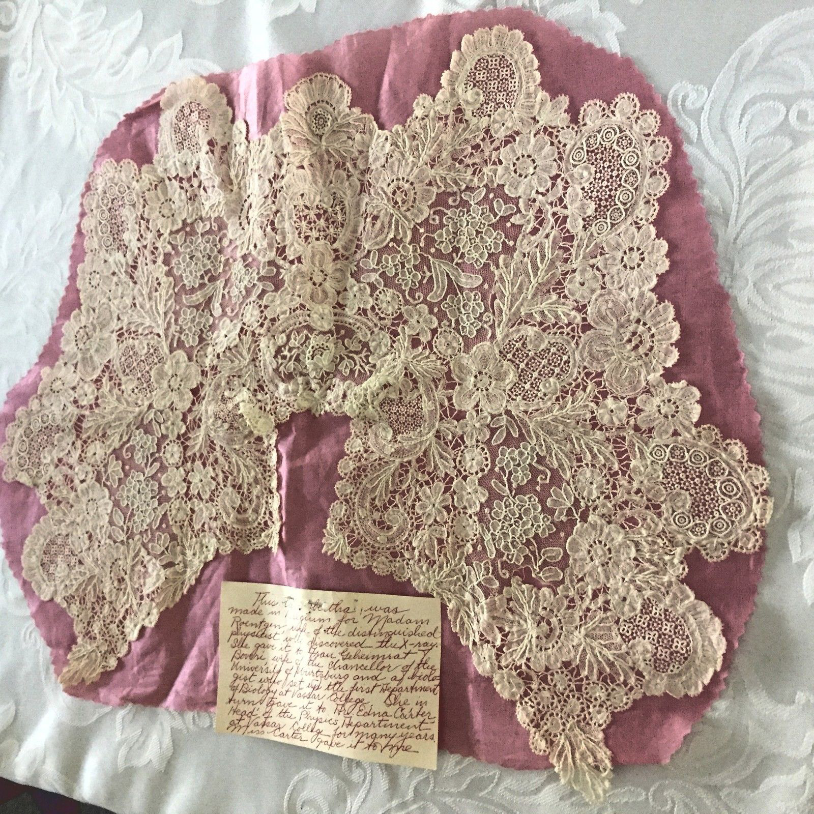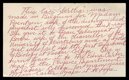 Duchesse de Bruxelles Collar with provenance 17.25" across, ~13" tall laid flat. It appears that the neckpiece is an addition, and the design is close, but doesn't quite match the outer collar. There are no raised roses in the main collar, and no raised elements on halfstitch. This might make the outer collar a little earlier than the neckpiece. Documentation: Signed E G Nelson on the back of the pink cloth mount. Evelyn G. Nelson was a professor of Economics at Vassar. The seller says it was found at a garage sale with the accompanying documentation. The identity of 'you' in the note is not known. Roentgen discovered X-Rays on November 8, 1895, and imaged his wife's hand on December 22, 1895. This is credited as the first X-Ray imaging a part of the human body. Her comment on seeing the image was "I have seen my death". purchased 03/07/2016 |
