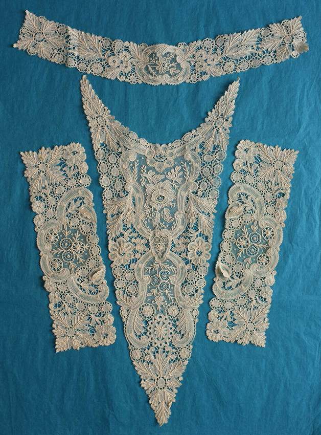 Duchesse de Bruxelles Frontpiece collar: 37 cm x 4.5 cm cuffs: 25 cm x 7 cm insert: 35 cm x 16 cm Duchesse de Bruxelles insert, collar and cuff set, unusual to find something this complete. One raised petal rose in the PdG insert in the insert, one flower with no raised work in the collar. The other PdG inserts have well-done jours. Typical Duchesse romantic floral design. Note the raised work on halfstitch in the scrollwork. purchased 07/05/2019 |