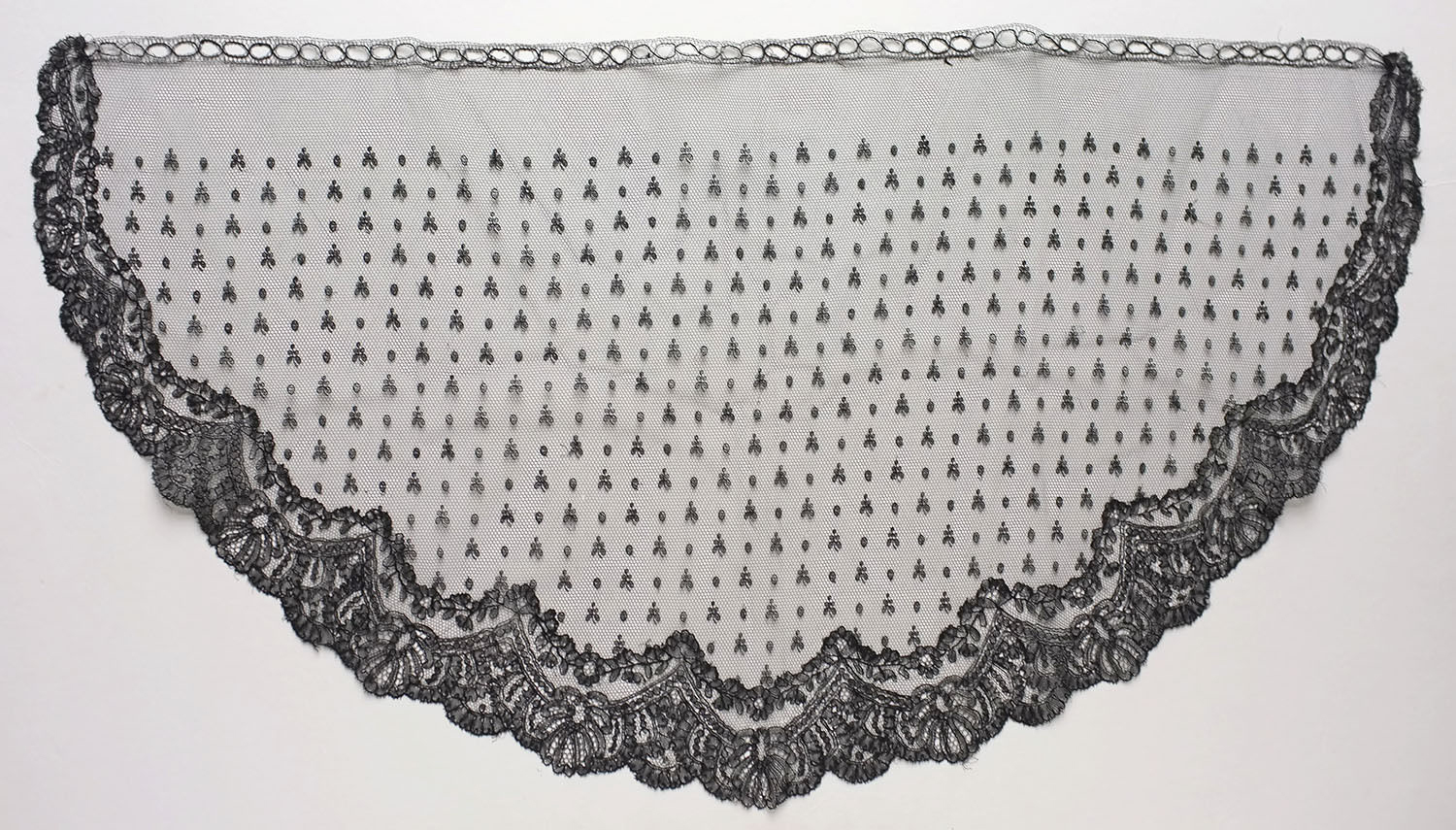 Semicircular Chantilly-Machine Net Bonnet Veil 16" x 30" Semicircular Chantilly bonnet veil, double row around edge. Machine center, 2 types of esprits. purchased 03/10/2017 |