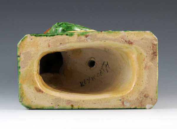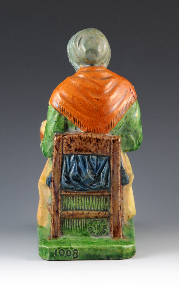 Flemish Pottery Lacemaker with commercial marks 6-1/4" high, 5" long, 3" wide It's a smaller, OK piece, perhaps a bit more in the mass production mode than others. The blue skirt doesn't seem to go anywhere in the design, curious. Some damage to the nose and left hand, otherwise intact. first posted 1/23/2009 |