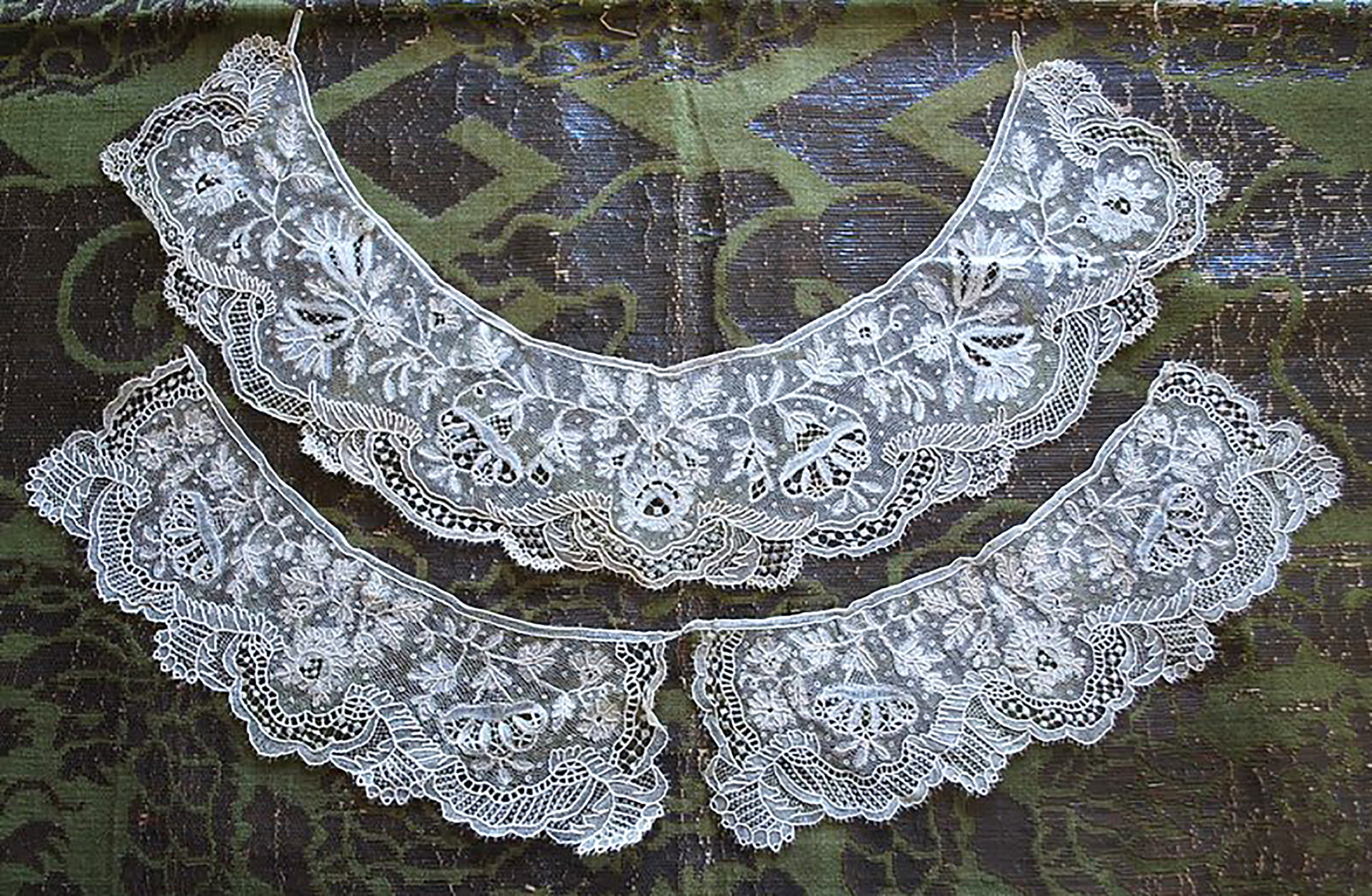 Point d'Angleterre small collar and cuffs collar: 14" x 2.75" cuffs: 7.5" x 2.5" Complex pattern with a kind of Point de Gaze buipure along bottoms. Varried and well-done needlemade fillings. Fine, precise work. purchased 02/05/2019 |