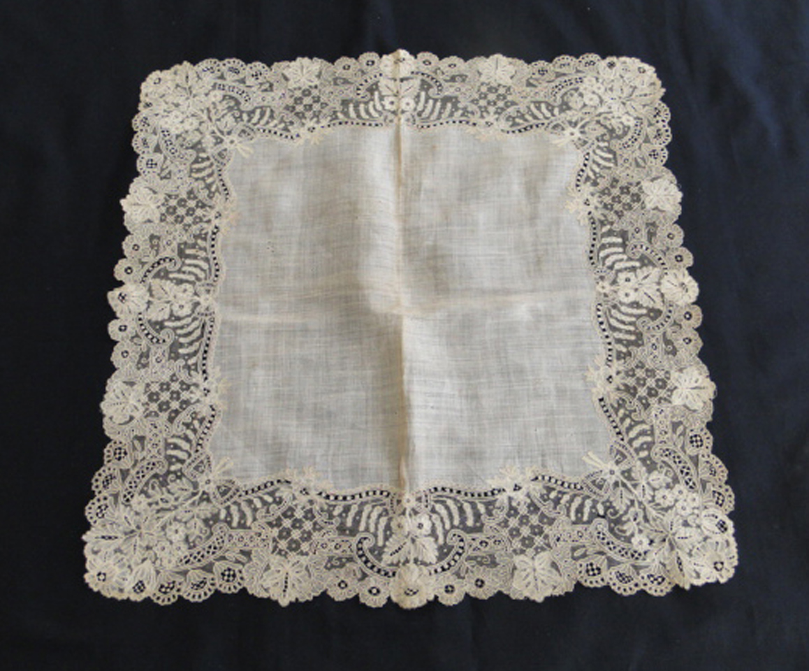 ~15" square Bobbinlace whiter than needlelace. Curious string around the outside, sometimes broken. No breaks, a little beige.