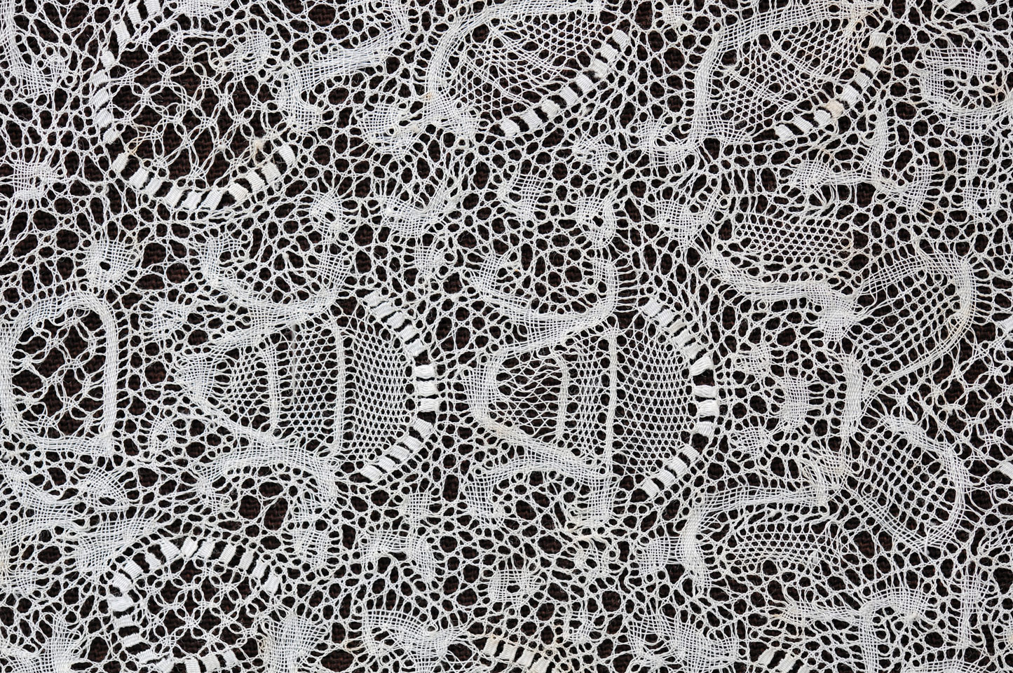 8" square, 3.25" deep edging Cotton, excellent condition - although dirt comes through when held to white background.