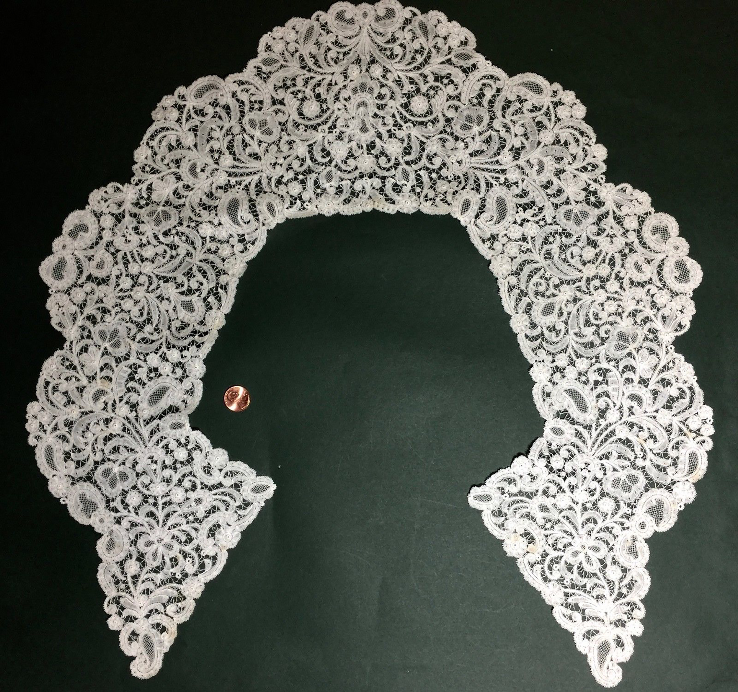 26" neckline, ~6" center depth, ~6.5" deep end points (66.04cm, 15.24cm, 16.51cm) Delicate motifs with raised buttonholed rings (perls). Very good design. Despite the rings, the motifs don't have the typical looped ede of Rosaline, so I'm putting this in Point de Flandre. The motifs do seem a bit large.