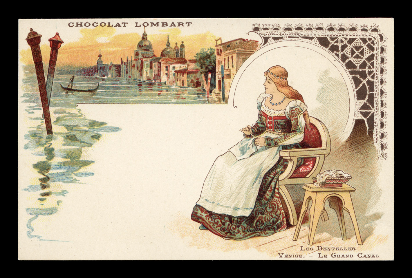 A. Norgeu, Paris "Les Dentelles". Set of six 5-1/2" x 3-5/8" cards of watercolor paintings representing lacemakers from different regions, in costumes which are not entirely accurate. Each includes a piece of lace, and a local landscape. Le Puy, Venice and Ireland have reasonable facsimiles of the local lace, the others just look pretty. Some of the cards are a bit skewed in cutting. Even with the design liberties, these are quite nice cards. I'm guessing around WWII.