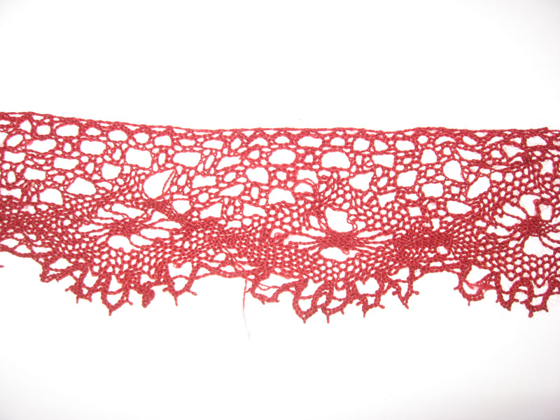 about 36" (91.44cm) Need better measurements. Wool lace, simple torchon design, of an unusual but documented 'burgundy' color. In England this was known as "Yak" lace, although the actual thread was Yorkshire wool. Yak lace was developed by Mr. E. Godfroy of Buckingham, who introduced it as a novelty lace in the 1850's. Little survives due to the delicacy of the thread.