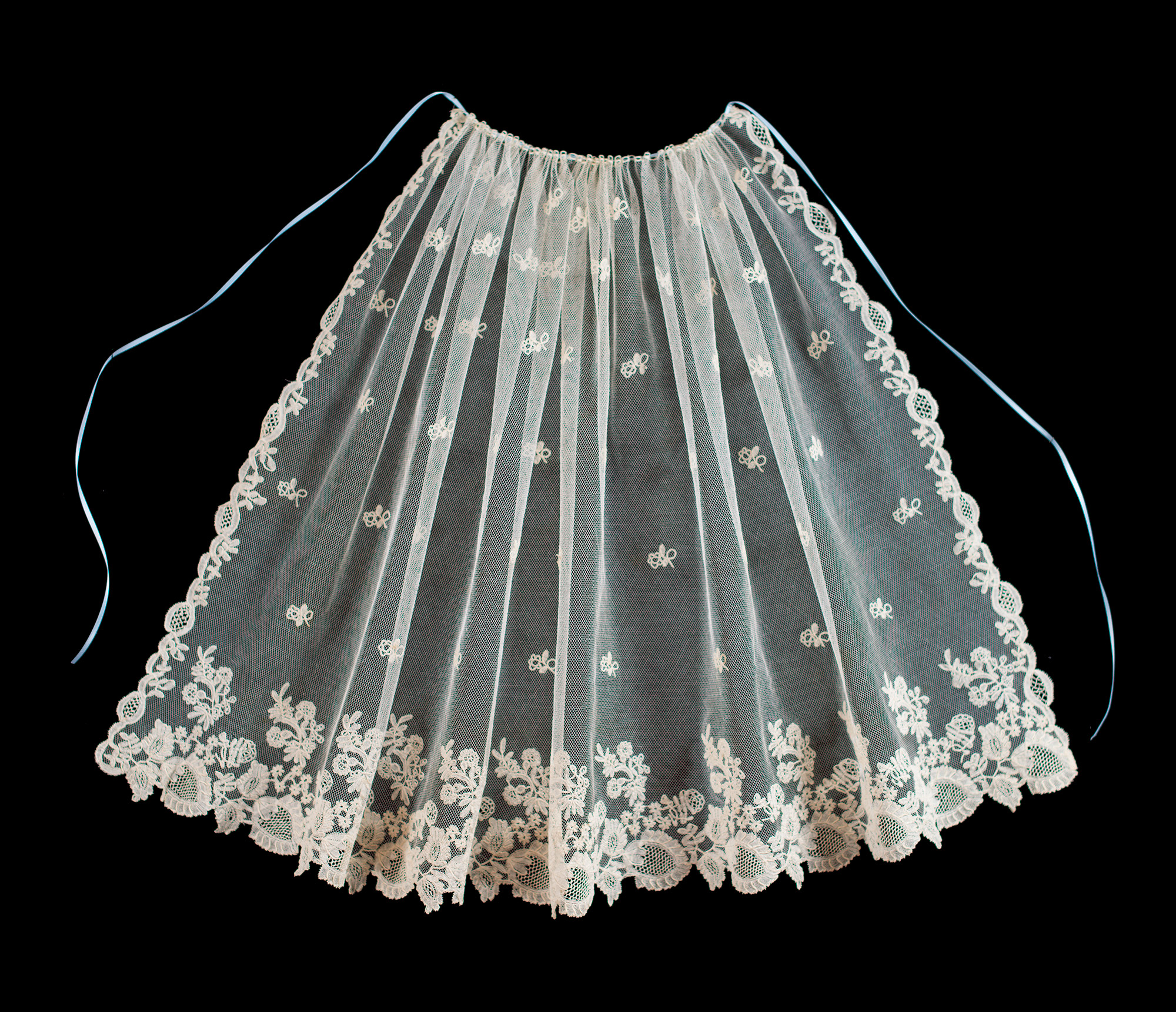 Honiton Applique Bonnet Veil 21" x 41" Elegant motifs, applique on machine net. Oval flowers with large fillings, leaves & flowers on border, 6 rows of bud esprits. A little beyond Snails/Slugs style. purchased 02/11/2013 |