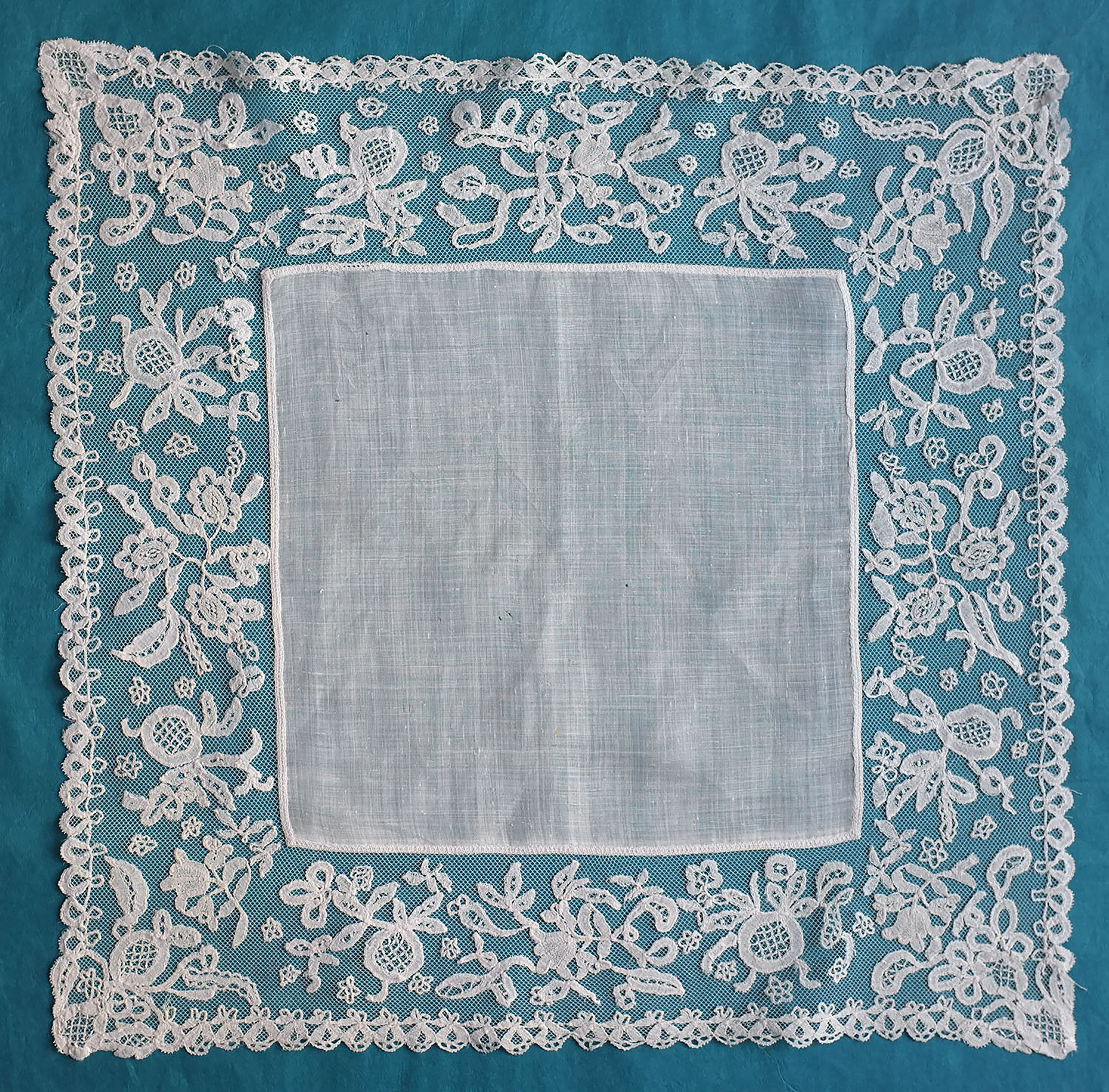 Honiton applique handkerchief, Snails/Slugs style. Motifs well separated, but design a little vague.