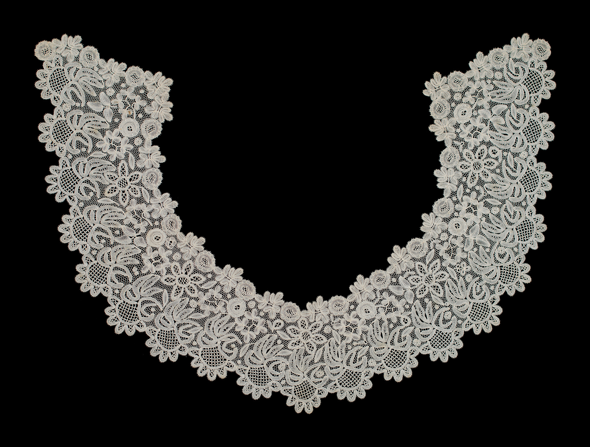Honiton Needlemade ground collar 35" neck edge. Back depth 6.5" neck to front point 7.5" Needlemade ground, well done but simple motifs. purchased 01/24/2014 |