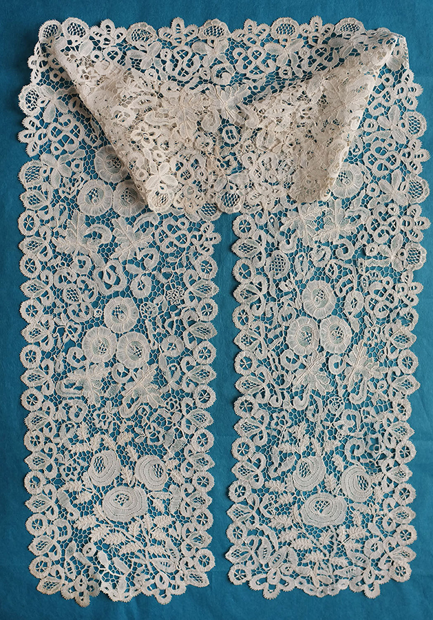 Honiton needlemade grounds rectangular scarf 6" x 46" Narrow rectangular Honiton scarf with a rather convoluted 2-thread needlemade ground. Good small motifs, but still a little Snails/Slugs style. purchased 01/20/2018 |