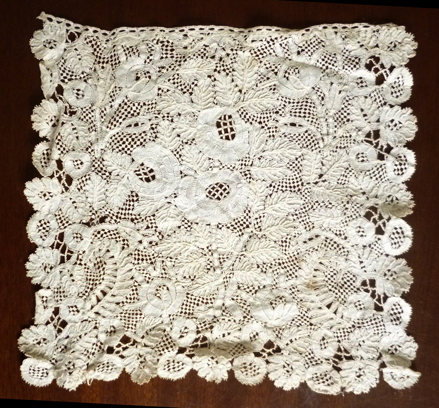 Honiton Panel with woven tally ground 18 cm x 19.5 cm (irregular) Honiton panel, probably used at the end of a cloth scarf. Woven tally ground, with a few brides along the edges. Good technique. purchased 03/01/2017 |