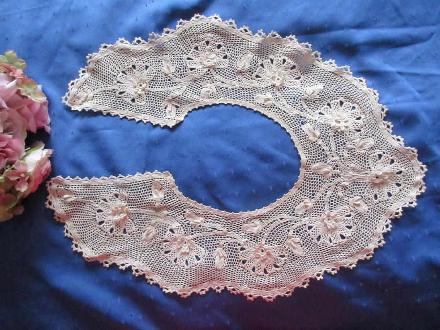 Guipure d'Irlande Dillmont collar 15" neckline, 5-1/4" center depth. 20th c, based on patterns in Thérèse de Dillmont (1846-1890) "La Guipure d'Irlande", DMC. purchased 10/19/2015 |