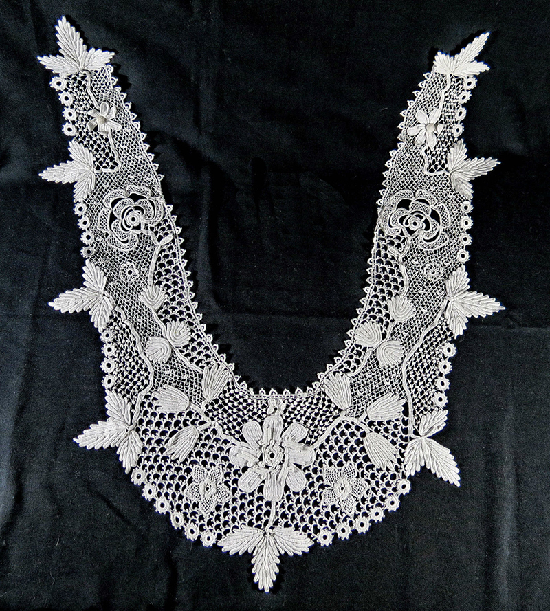Guipure d'Irlande Collar 20.5" x 22" Center flower with raised work, padded flower centers at tips, ring/trefoil leaf edge, 3 grounds. purchased 10/19/2015 |
