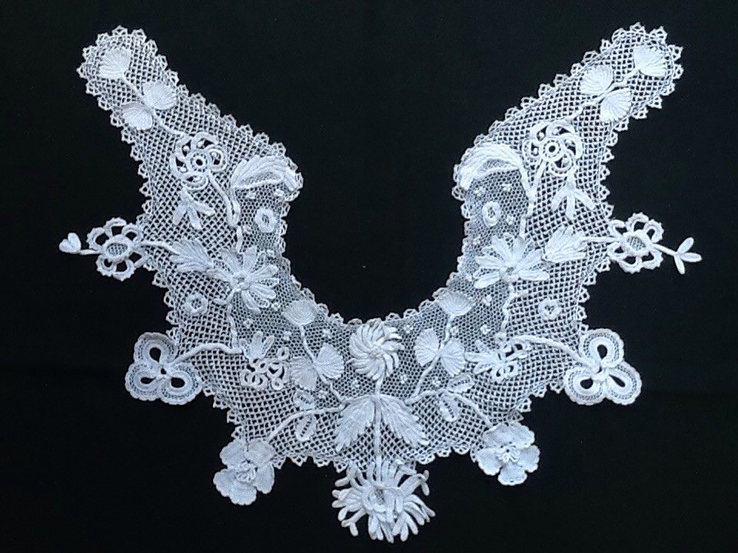 Guipure d'Irlande collar 70 cm x 16 cm Typical French design with chrysanthum leaves - more elaborate with pendants around the outer edge. 2 grounds. purchased 01/17/2018 |