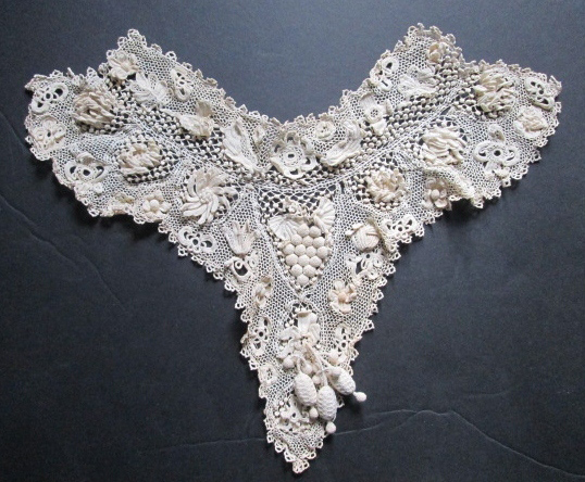 Guipure d'Irlande neckpiece and frontpiece 18" wide, 11.5" high Clones knot variation, padded grapes and tassles, chrysanthemum flowers. Triangular insert and neckpiece, two small buttons. 2 grounds. purchased 10/19/2015 |