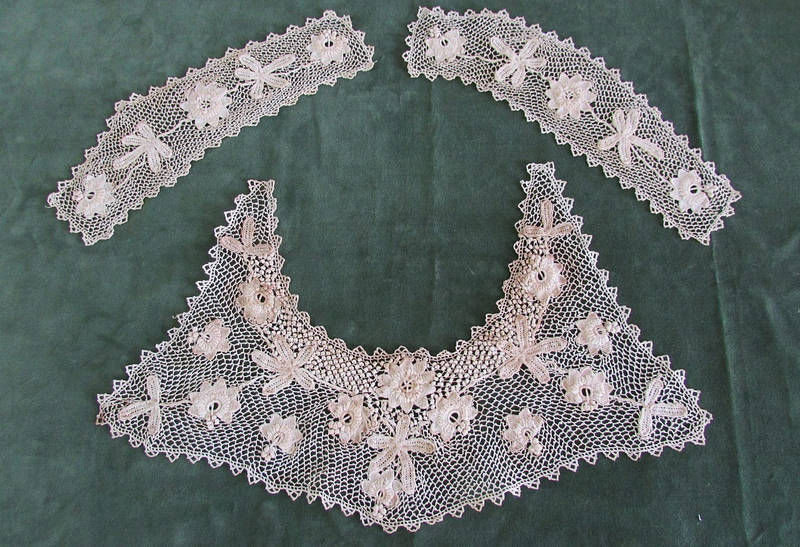 Guipure d'Irlande collar and cuffs 11" x 3-1/4" cuffs, 16.5" x 10.5" collar Bullion knots along neck and flower centers. Picoted mesh elsewhere. Flowers with pendent centers. purchased 09/07/2014 |