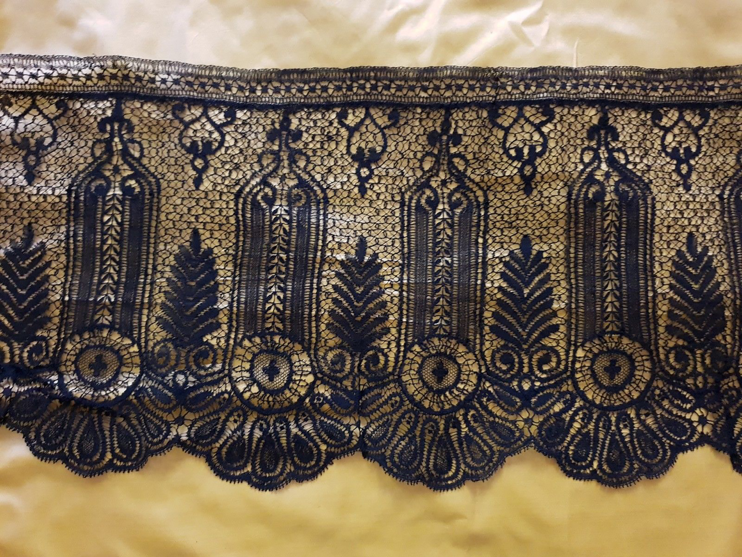 Le Puy border 11" x 128" Vertica, architectural design with complex ground of picoted ovals and crosses. Small crosses on point ground in circular cartouches along lower border. Engrelure is consistent in design, but probably a separate piece. An elegant piece. purchased 12/02/2018 |