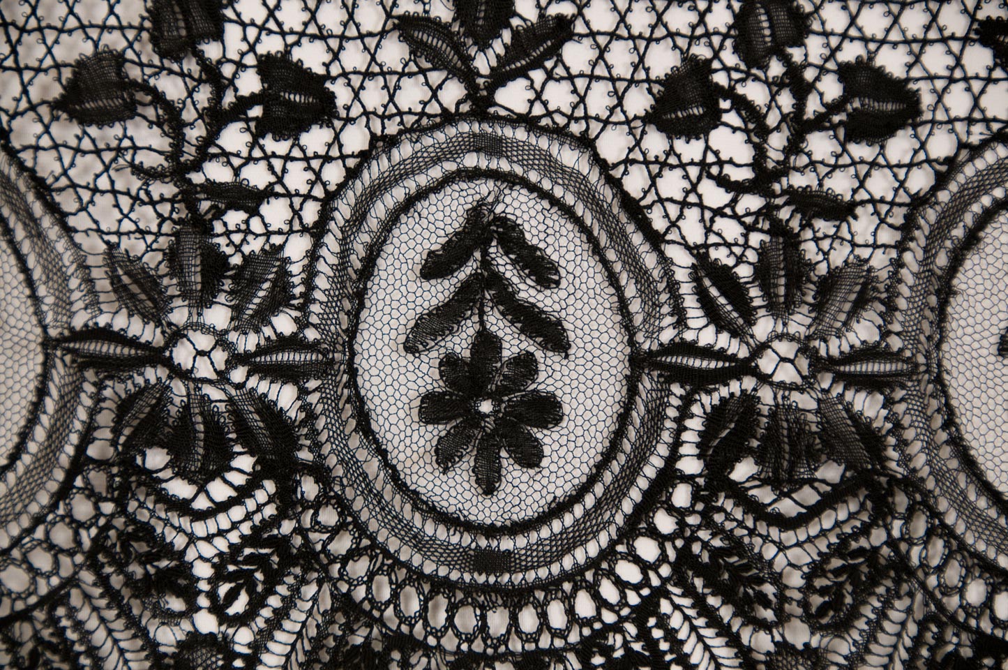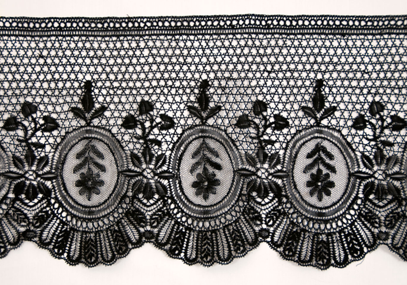 9.5" x 100" Good condition. Black silk, downward flower on point ground in oval cartouche. Picoted star bride ground.