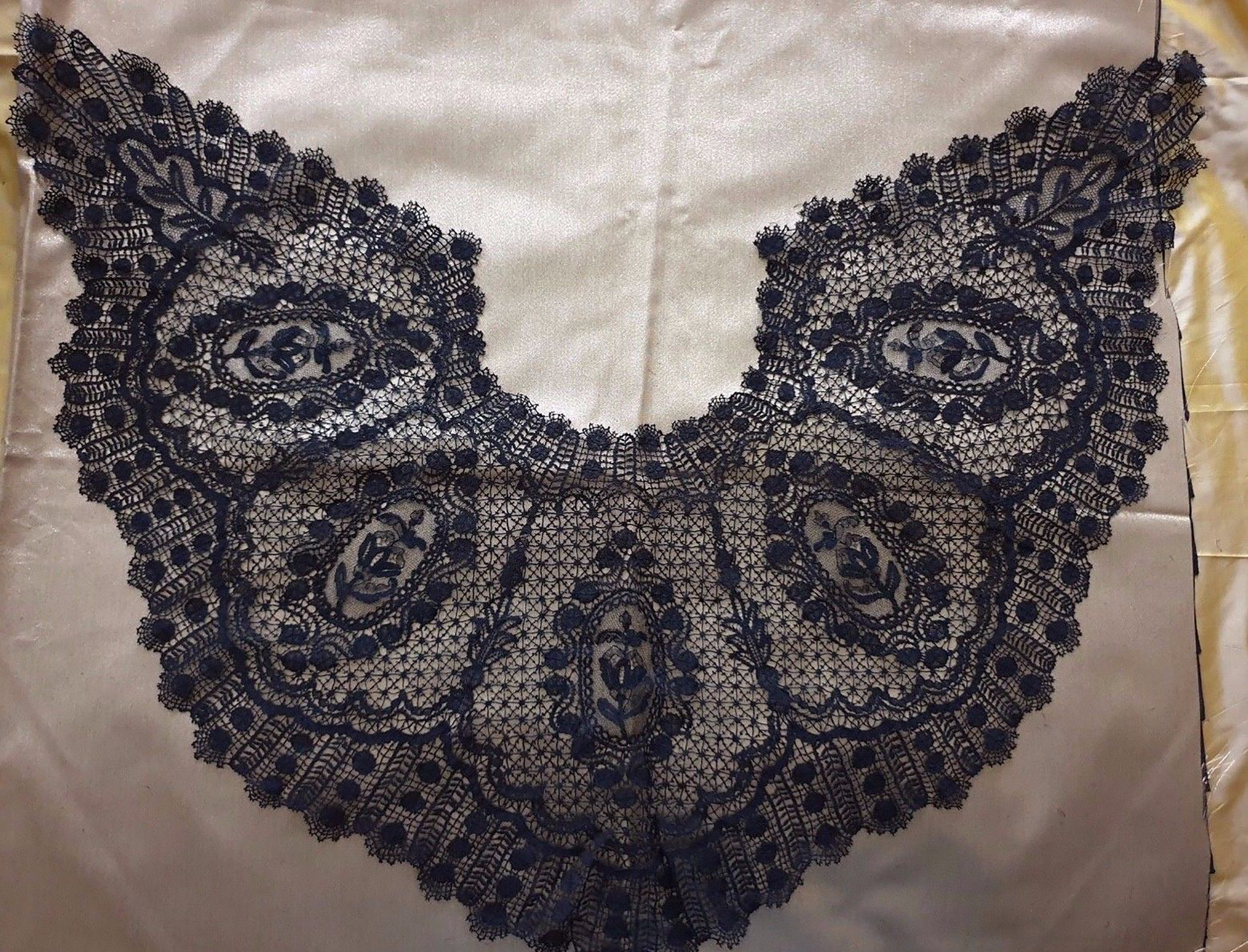 Le Puy Shawl Collar 68" outer edge, 12.5" max depth. Good design of flowers on point ground in 5 oval cartouches, and 2 leaf sprays on point ground in the collar tips. Interesting picoted square and 'X' ground. Small round motifs with raised tally crosses on each are the main other design element. What may be the same piece is illustrated in "Antique Lace: Identifying Types and Techniques" by Heather Toom, plate 261, page 222. purchased 12/08/2018 |