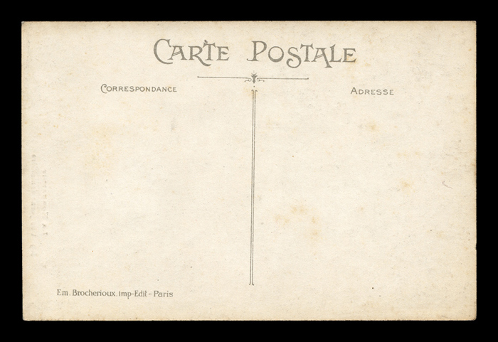 The backsides of postcards are remarkably consistent across different producers, and often provide a clue as to the date of issuance. I have scanned unwritten examples to associate with each card - these are the same as the ones used on each card, but without any writing that might be present on that particular card. Divided backs started to appear in France in 1907, and were in general use by 1910. Click here to return to Brocherioux postcards. first posted 3/8/2009 |