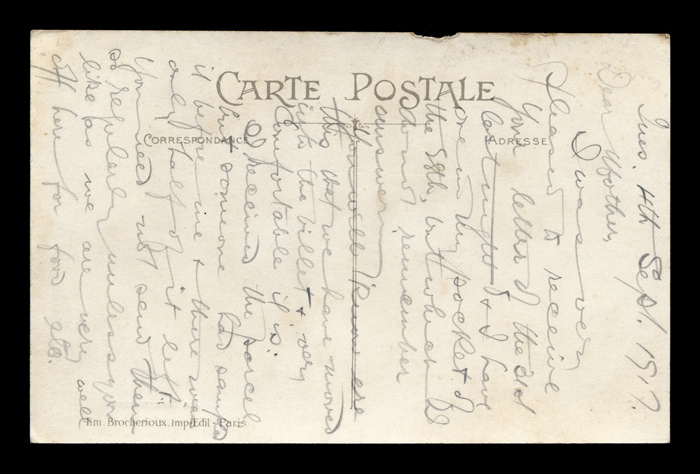 The backsides of postcards are remarkably consistent across different producers, and often provide a clue as to the date of issuance. I have scanned unwritten examples to associate with each card - these are the same as the ones used on each card, but without any writing that might be present on that particular card. Divided backs started to appear in France in 1907, and were in general use by 1910. Click here to return to Brocherioux postcards. first posted 5/31/2009 |