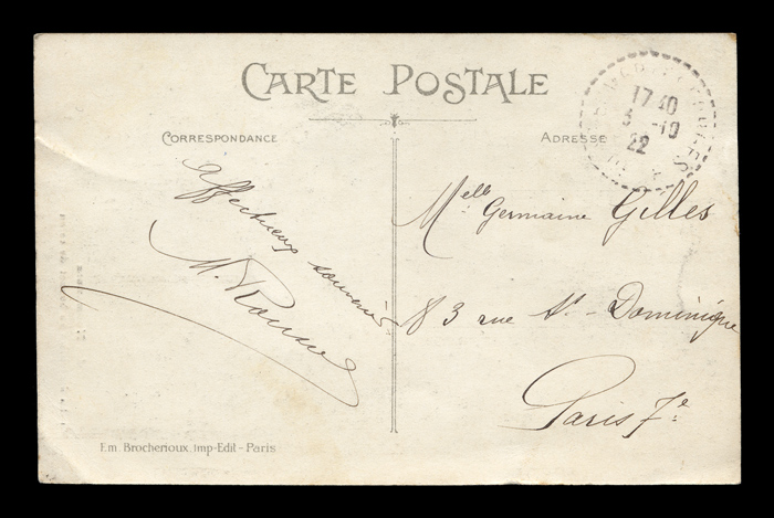 The backsides of postcards are remarkably consistent across different producers, and often provide a clue as to the date of issuance. I have scanned unwritten examples to associate with each card - these are the same as the ones used on each card, but without any writing that might be present on that particular card. Divided backs started to appear in France in 1907, and were in general use by 1910. Click here to return to Brocherioux postcards. first posted 11/26/2009 |