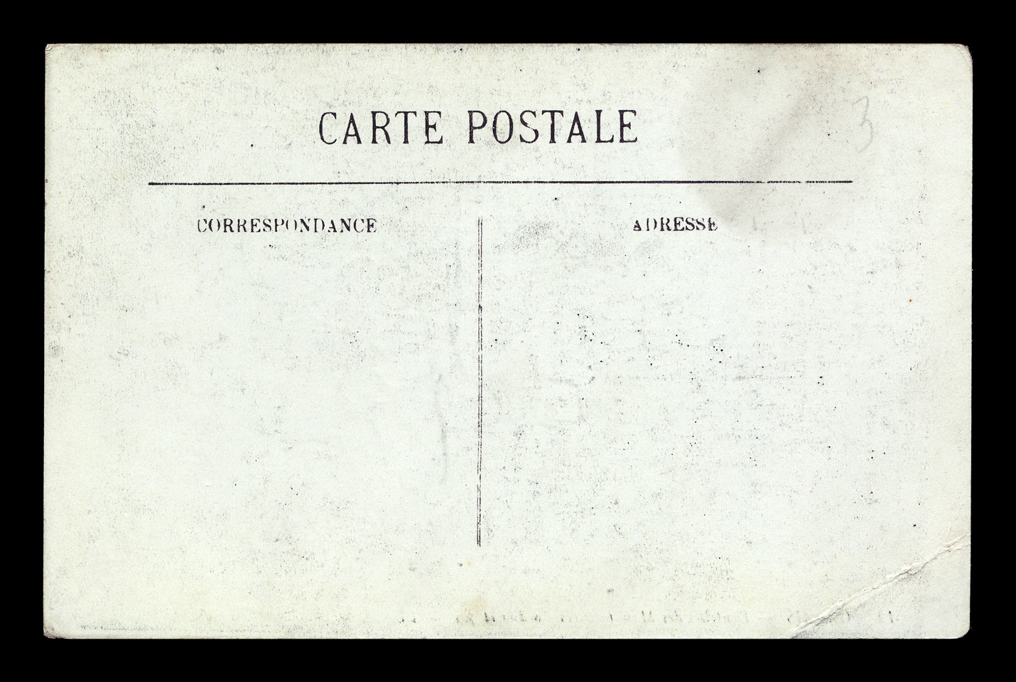 The backsides of postcards are remarkably consistent across different producers, and often provide a clue as to the date of issuance. I have scanned unwritten examples to associate with each card - these are the same as the ones used on each card, but without any writing that might be present on that particular card. Divided backs started to appear in France in 1907, and were in general use by 1910. Click here to return to Lévy Calais postcards. first posted 11/26/2009  |