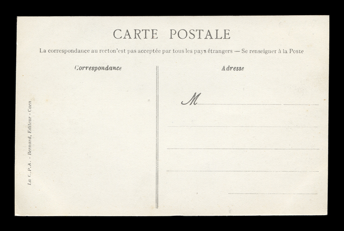 The backsides of postcards are remarkably consistent across different producers, and often provide a clue as to the date of issuance. I have scanned unwritten examples to associate with each card - these are the same as the ones used on each card, but without any writing that might be present on that particular card. Divided backs started to appear in France in 1907, and were in general use by 1910. Click here to return to La C. P. A. postcards. first posted 6/21/2009 |