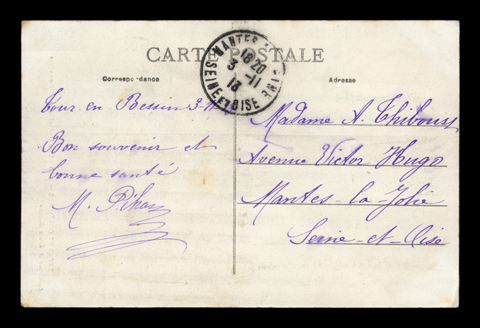 The backsides of postcards are remarkably consistent across different producers, and often provide a clue as to the date of issuance. I have scanned unwritten examples to associate with each card - these are the same as the ones used on each card, but without any writing that might be present on that particular card. Divided backs started to appear in France in 1907, and were in general use by 1910. Click here to return to A. Louis postcards. first posted 6/22/2009 |