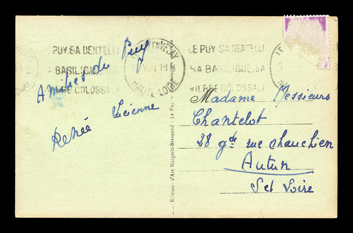 The backsides of postcards are remarkably consistent across different producers, and often provide a clue as to the date of issuance. I have scanned unwritten examples to associate with each card - these are the same as the ones used on each card, but without any writing that might be present on that particular card. Divided backs started to appear in France in 1907, and were in general use by 1910. Click here to return to Margerit-Bremond postcards. first posted 7/2/2009 |