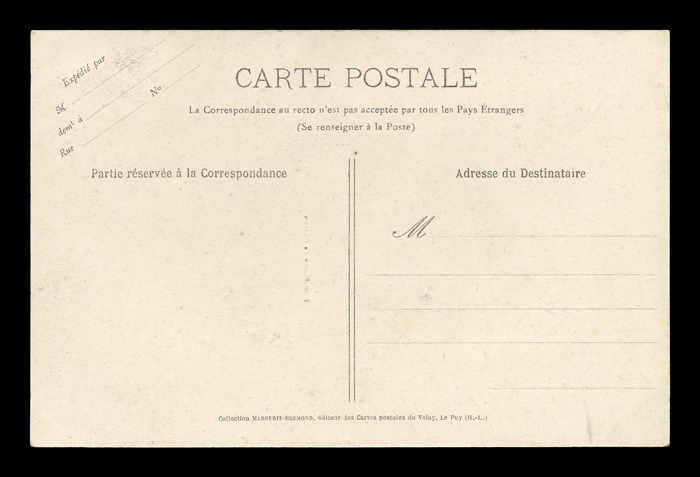 The backsides of postcards are remarkably consistent across different producers, and often provide a clue as to the date of issuance. I have scanned unwritten examples to associate with each card - these are the same as the ones used on each card, but without any writing that might be present on that particular card. Divided backs started to appear in France in 1907, and were in general use by 1910. Click here to return to Margerit-Bremond lace postcards. first posted 7/18/2009 |