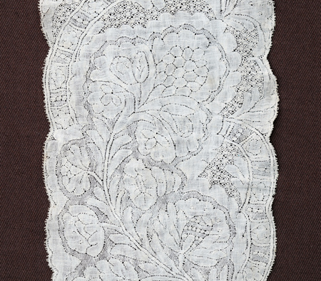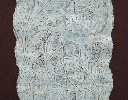Valenciennes Lappets 23" x 4", 22-1/2" x 4" Fond de neige, large stylized flowers against 1/2 stitch, Bizaare pattern. wave pattern, square ends, mirror images, design does not repeat. purchased 10/06/1978 |