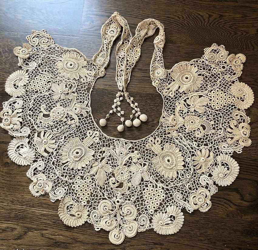 Irish Crochet silk parure 17" neckline, 8.5" back depth, 19" tie/tassle length Silk thread crochet, some raised work with needlelace spider fillings. Grapes, leaves, and flower design, with a few trefoils. Unusual ties with tassels. The tassels are normally a French feature, but I think this is Irish since the French aren't know for silk crochet. Picoted square ground, no special edge treatment. purchased 05/13/2019 |