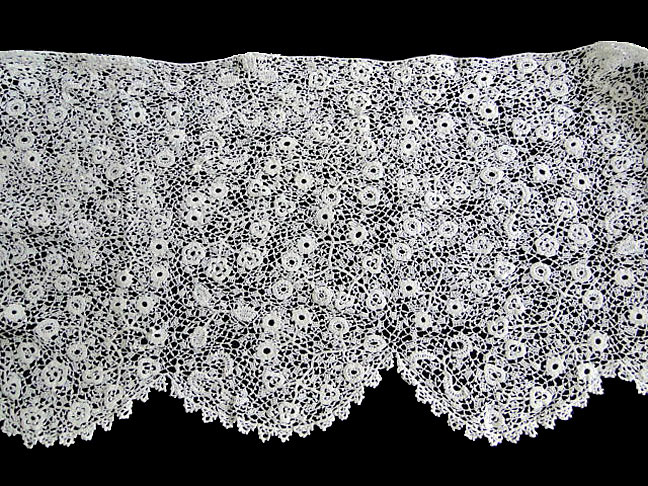 Irish Crochet Imitation Guipure border 193" x 10" Imitation Guipure border, Beautiful scalloped design, with pinwheel design with various terminations. Very fine workmanship. purchased 07/21/2010 |