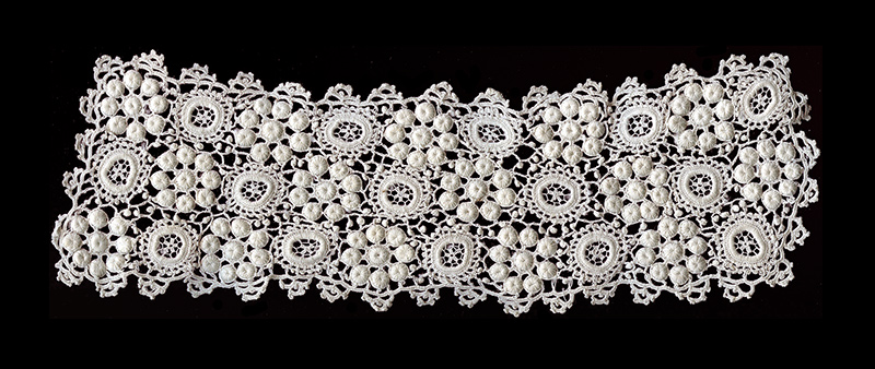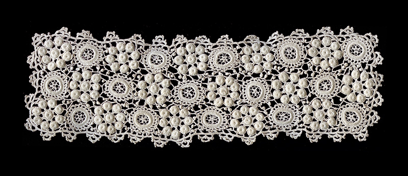 Snowflake design, raised wheels with needlelace fillings, clones knots.