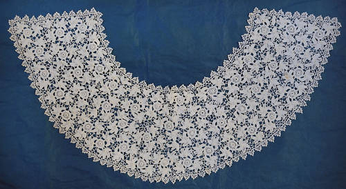 Irish Crochet dense design collar 22" wide, 6-1/2" across work. Dense design of same motif, wheel with 3 branched leaves, pinwheel. Raised rings. Almost fan-shaped. purchased 11/24/2010 |