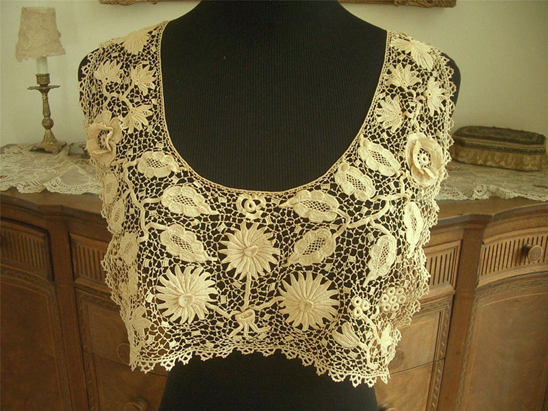 Irish crochet frontpiece 13" wide, 27" neckline, 47" outside edge, rectangular front with slightly curved ends. Design of raised roses, 3 daisies center front, leaves with rectangular grids. purchased 05/27/2012 |