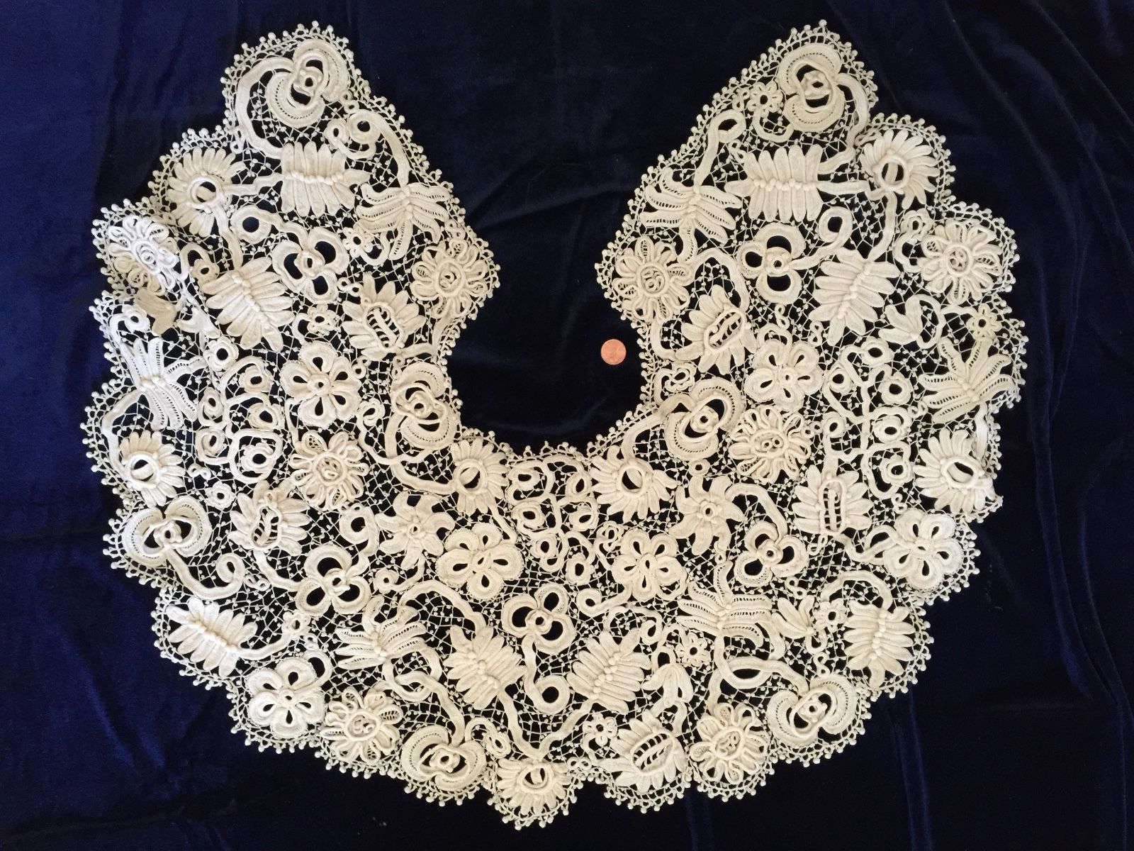 Tight weaving, lots of raised work, clones knots on mesh and around border.