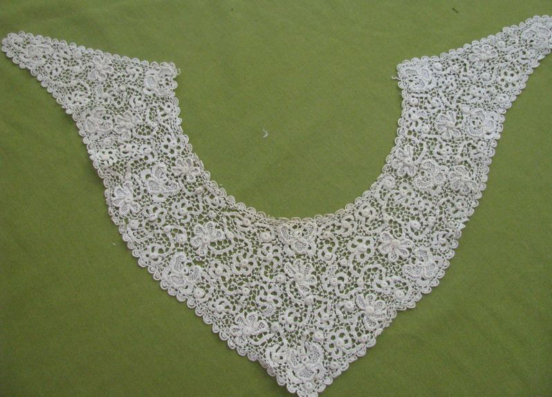 Irish Crochet collar 43.5cm each from corner to front point and approx 55.5cm across from tip to tip, with a depth of approx 14.5cm at its widest parts, tapering to approx 8cm at the narrowest, and then widening to 18cm at the hem. Clones knots? Small motifs, lots of raised work. purchased 10/17/2011 |