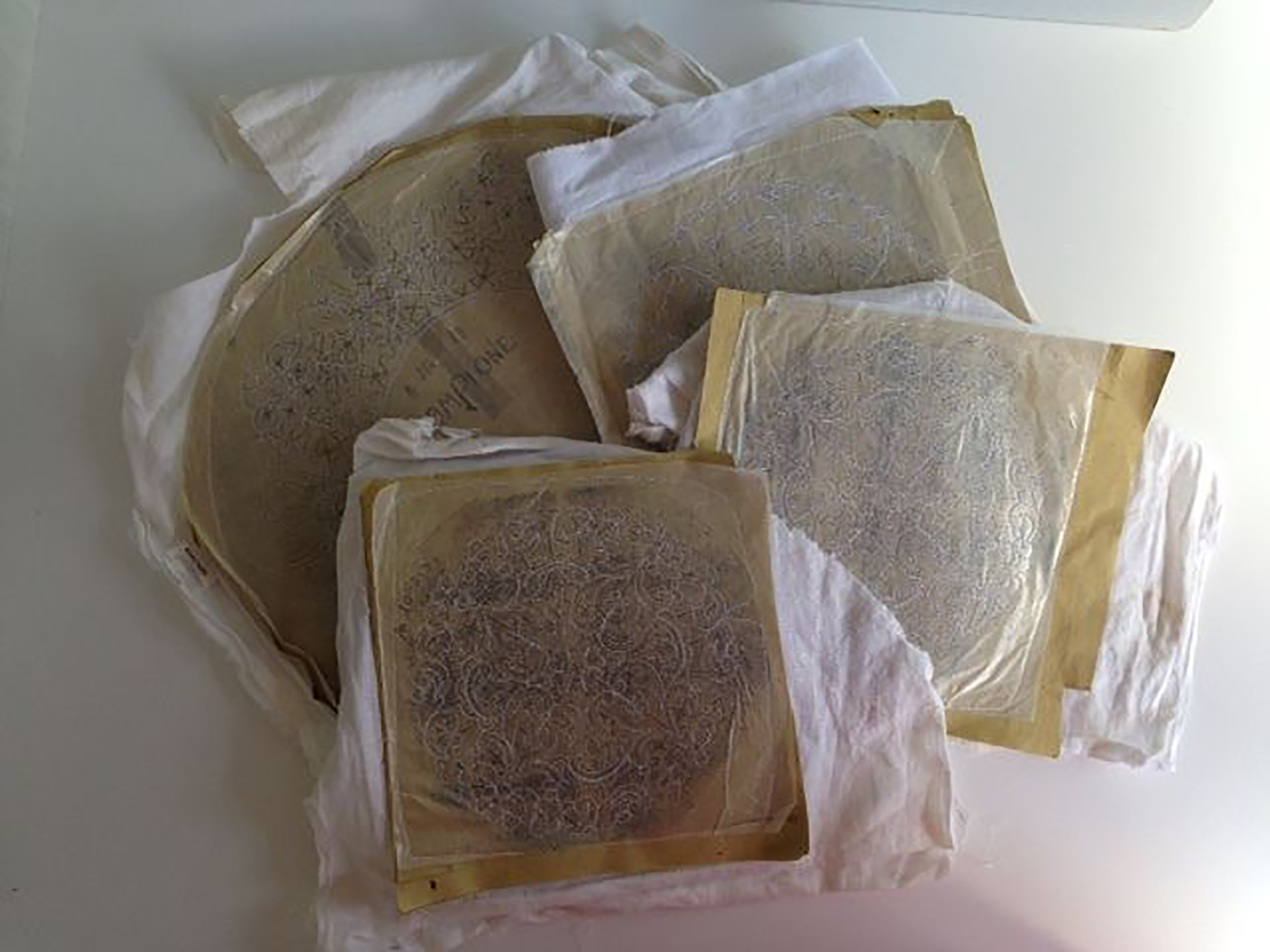 Collected by Louise Senécal (Canada) on a trip to Burano. Individual Burano patterns on beige paper with glassine, machine-sewn trace as expected. Collar labeled Campione (Sample) 114 R2