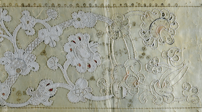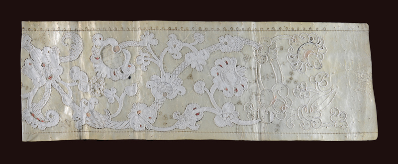 Gros Point Border 12-1/2" x 4-1/4" An exemplary example of Gros Point in progess on a vellum pattern. Note the figure of a rabbit in one flower. Some motifs have further prickings which might be for the raised cordonnet. Note the very elaborate bride decoration in one spot, which doesn't seem to match the one worked spot. The date of this piece is uncertain, and there is a possibility it is for a flat piece. But it does have the feel of a early piece, perhaps late 1600's. purchased 06/13/2008 |