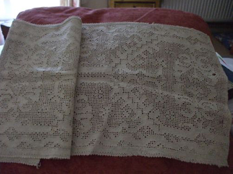Punto Tirato Tela Sfilata The Ladies Work Society was established in 1875 and was part of the wider Arts and Crafts movement that was emerging at the end of the 19th century, led by artists such as William Morris. The Ladies Work Society provided a respectable means of employment for distressed gentlewomen who had needlework skills and education but no other means of making a living. Decorative embroidered clothing, laces and textiles were made to order through the Society or sold through their premises in London. This panel of cutwork lace has been made using the same principles as cutwork lace was made in the late 17th century. Large areas of fabric were cutaway and the spaces filled with needlework. Like the early examples, this panel has been made using linen and is very cool to the touch. The panel has some interesting designs and is in good condition for its age, there are a couple of holes and fraying along one bottom edge and one small repair that I can see.The panel measures 30.5" x 10". first posted 10/30/2011 |