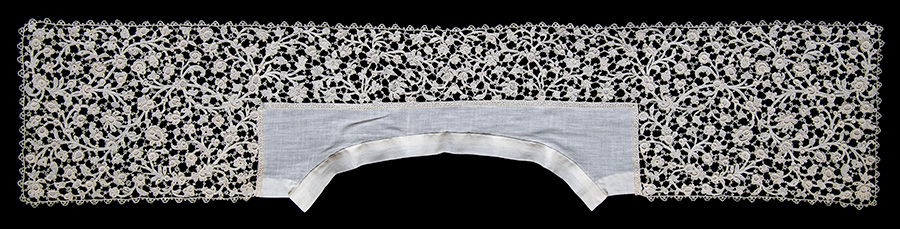 laid flat 34-3/4", bands 7.5" x 9.5", neckpiece 16" x 4.5" Lent to the Minneapolis Institute of Art September 2015 to August 2016 for exhibition. MIA gave a much more detailed condition report, and mounted it with a linen collar on a bust as it would have been worn in the late 1700's. It was not labeled as lent for MIA's 100th anniversary because the loan went into 2016. It would have fit better on the bust if there had been a tuck taken in the back neck band, as seen in contemporary examples. Two cloth-covered rolls were inserted vertically to give the needed relief. The piece was shown next to a contemporary engraving of a man wearing a similar band. MIA left the collar attached and gave me the two rolls. Overly good example of a bib-fronted collar - need better verification of an early date. The smaller motifs are often called 'Rose Point'. Engrelure added around the neckline.
