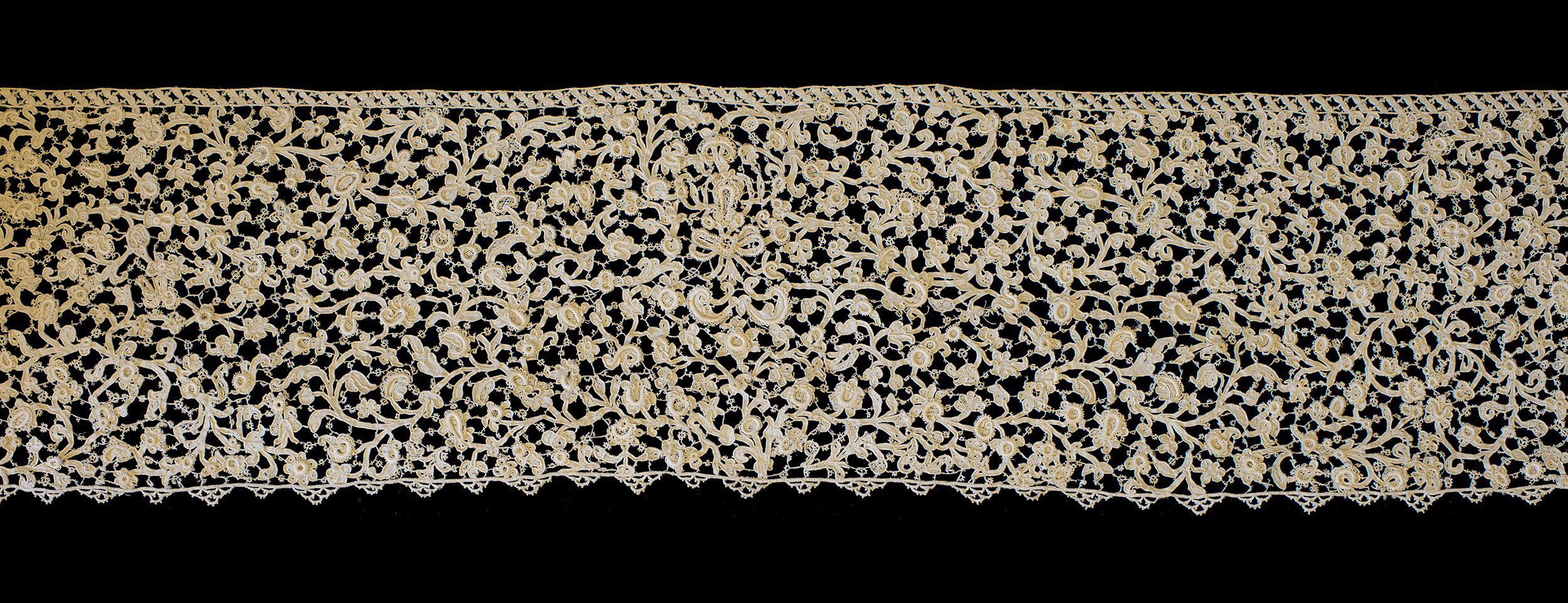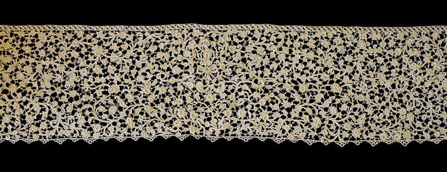 113.5" x 5.75" (288.29cm x 14.61cm) A Venetian Rose Point border with rather confused design, it appears to have been reassembled, sometimes with a few elements from Point de Neige. Bobbin-made engrelure, and the lower border of tiered looped buttonhole bars doesn't look exactly contemporary, and proceeds to edge both ends. There is some attempt at symmetry, but the vertical elements don't match along the length. Attempts at tracing the symmetry fall apart quite quickly.